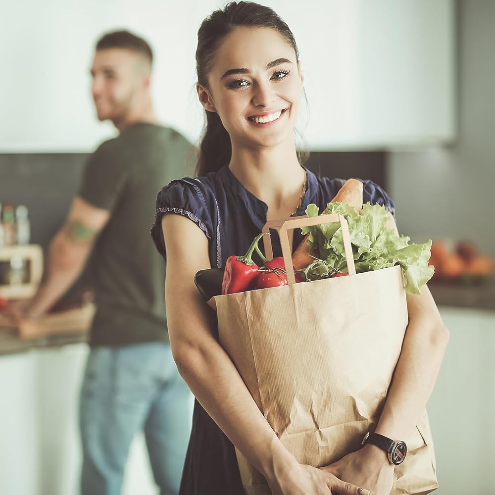 Kraft Paper Grocery Bags with Handles: Holding up to 15LBs, the hidden flat handles are folded inside for easy storage, and require you to pull them out. The flat handles provide a comfortable grip, making it easy to carry even heavy loads