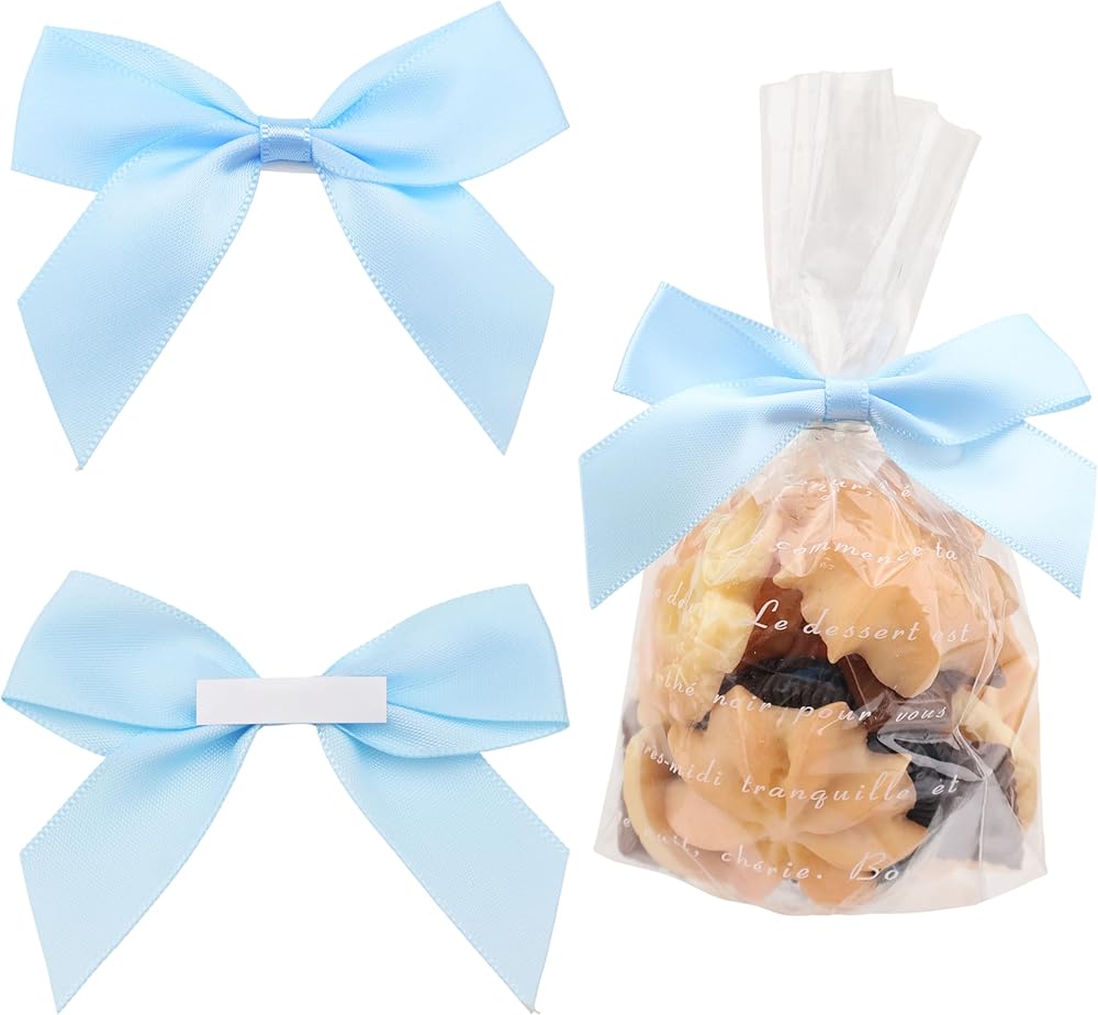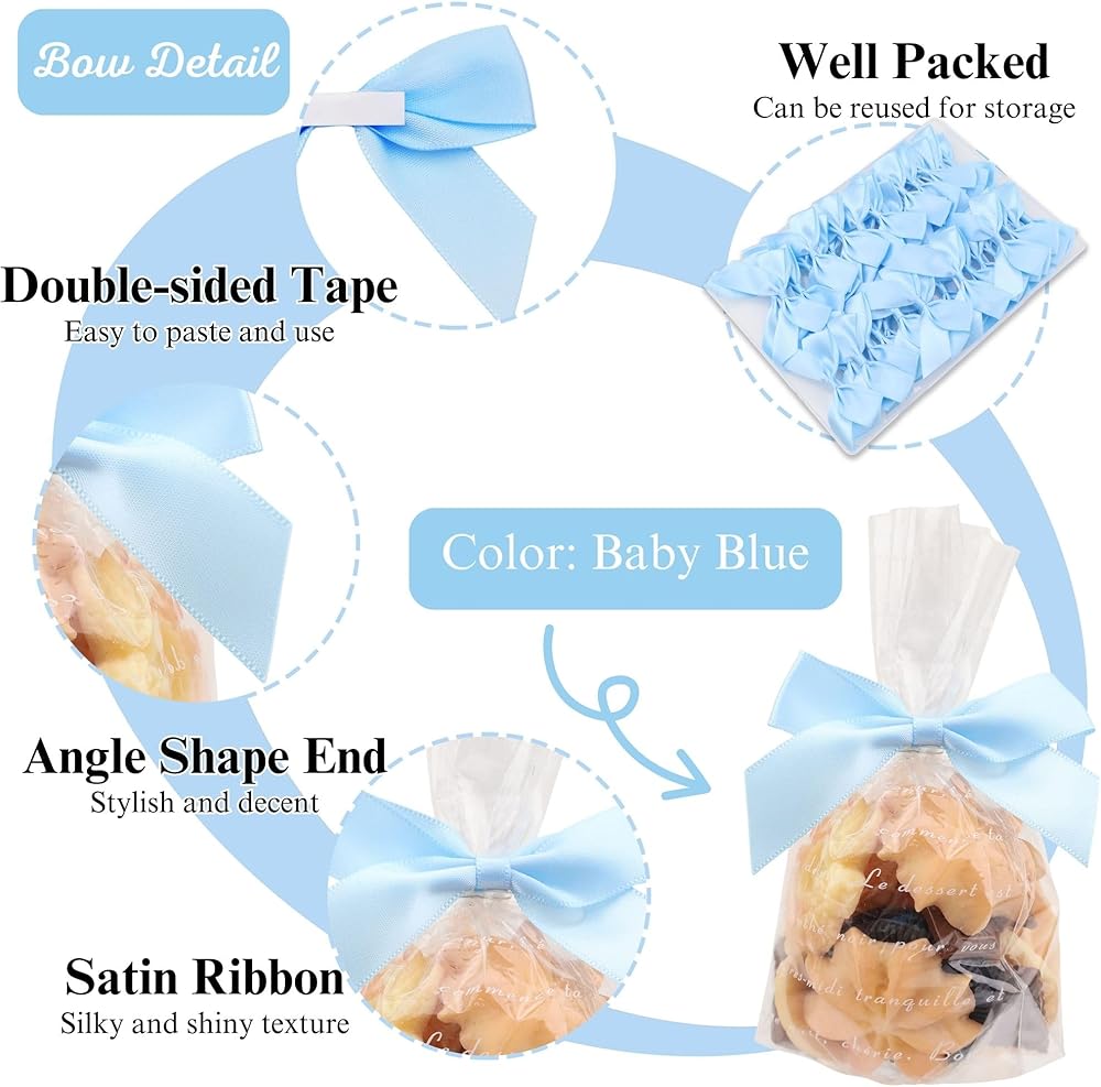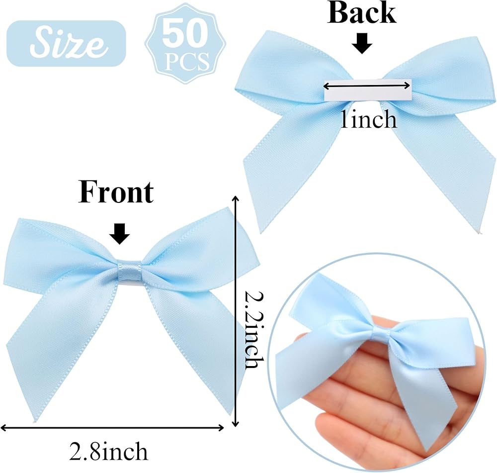 [ Bow Details ] The mini bows measure approximately 2.2 inches. With 1 inch double-sided tape for easy attachment to treat bags, candy apples, cake pops and favor boxes and more.Made of high quality satin ribbon and handmade in a good shape. Each bows is unique, please carefully look at its size before buying.