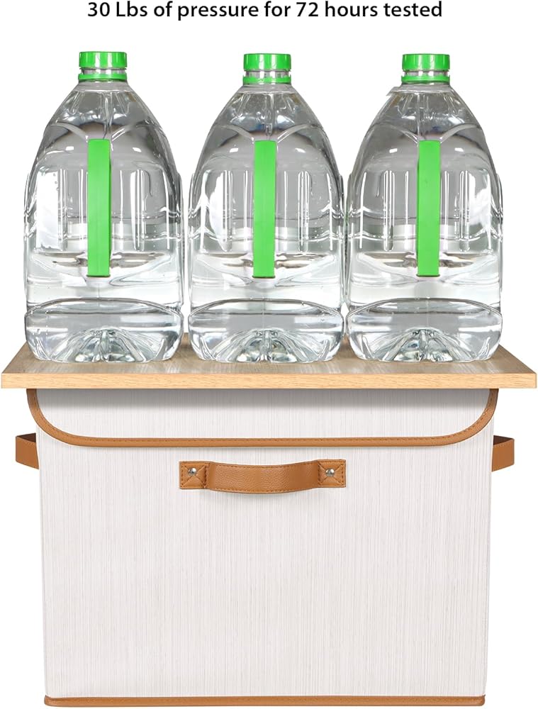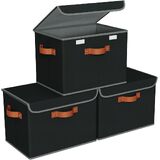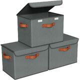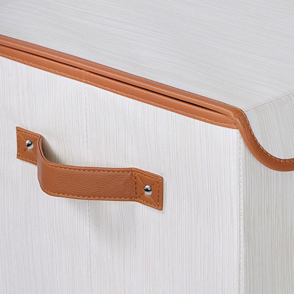 【Durable Linen Fabric and Leather Handles】This collapsible storage bins with lid feature a high-quality linen fabric that is odorless and free of chemical residues.Thickened leather handles in three sides are reinforced with double-layer fabric and X-shaped stitching, making it comfortable to carry heavy loads. Its brown leather handles make a stylish decoration that blends well with any home decor, adding an elegant touch.