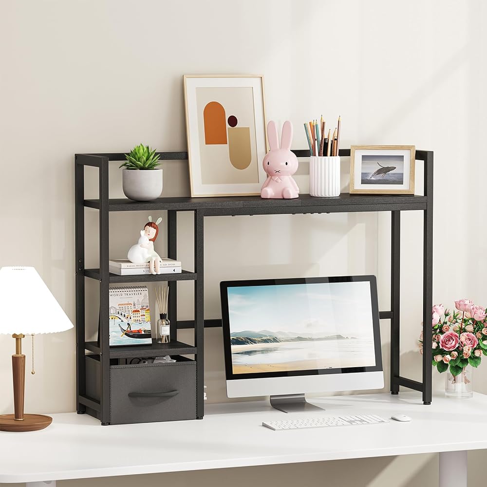 Marbrasse Desk Shelf with Drawer, 40" Desk Hutch for Computer Monitor, Desk Shelf for top of Desk, Wooden Desktop Bookshelf Storage Rack for Home Office Dorm - Black