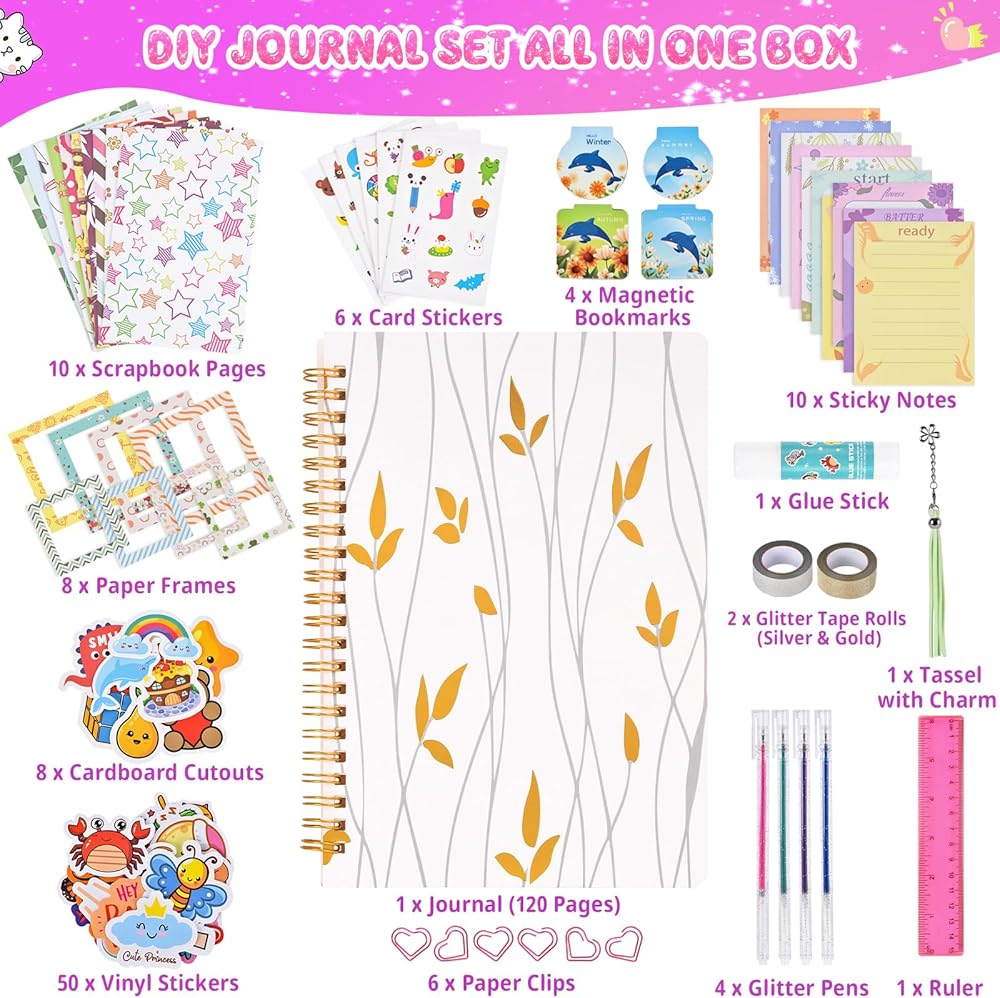 【All-in-One Journaling Art Kit】This journal set comes with everything a girl needs to personalize her diary, including 1 x Journal (120 Pages), 50 x Vinyl Stickers, 6 x Card Stickers, 8 x Cardboard Cutouts, 10 x Sticky Notes, 8 x Paper Frames, 10 x Scrapbook Pages, 4 x Magnetic Bookmarks, 1 x Glue Stick, 1 x Tassel with Charm, 4 x Glitter Pens, 2 x Glitter Tape Rolls (Silver & Gold), 6 x Paper Clips, 1 x Ruler.