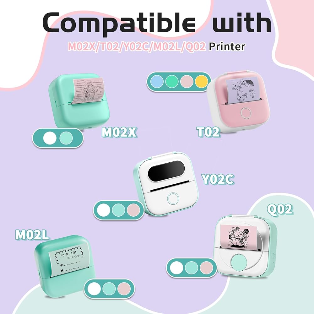 Compatible with the T02, M02X, Y02C, M02L and Q02 mini sticker printers. Tighten the paper roll when placing the paper in the printer carriage. Place the print side up and leave a 2 mm blank edge for easy tear-off