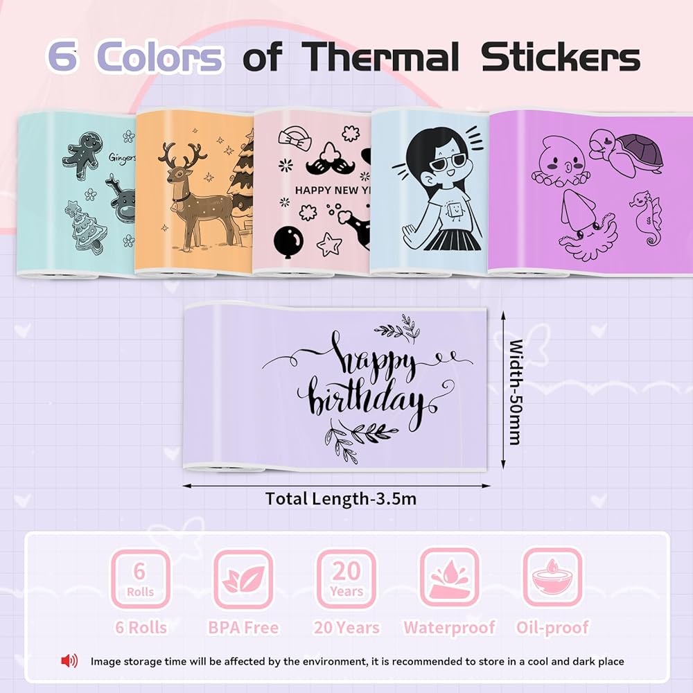 Ponek thermal stickers in 6 colors: This T02 mini printer sticker paper comes in a box of 6 rolls, Purple, Pink, Orange, Blue, Green, Deep Purple, each measuring 50mm x 3.5m and can only print in black and white. Images can be stored for up to 20 years, but please keep in a dry, cool and dark place