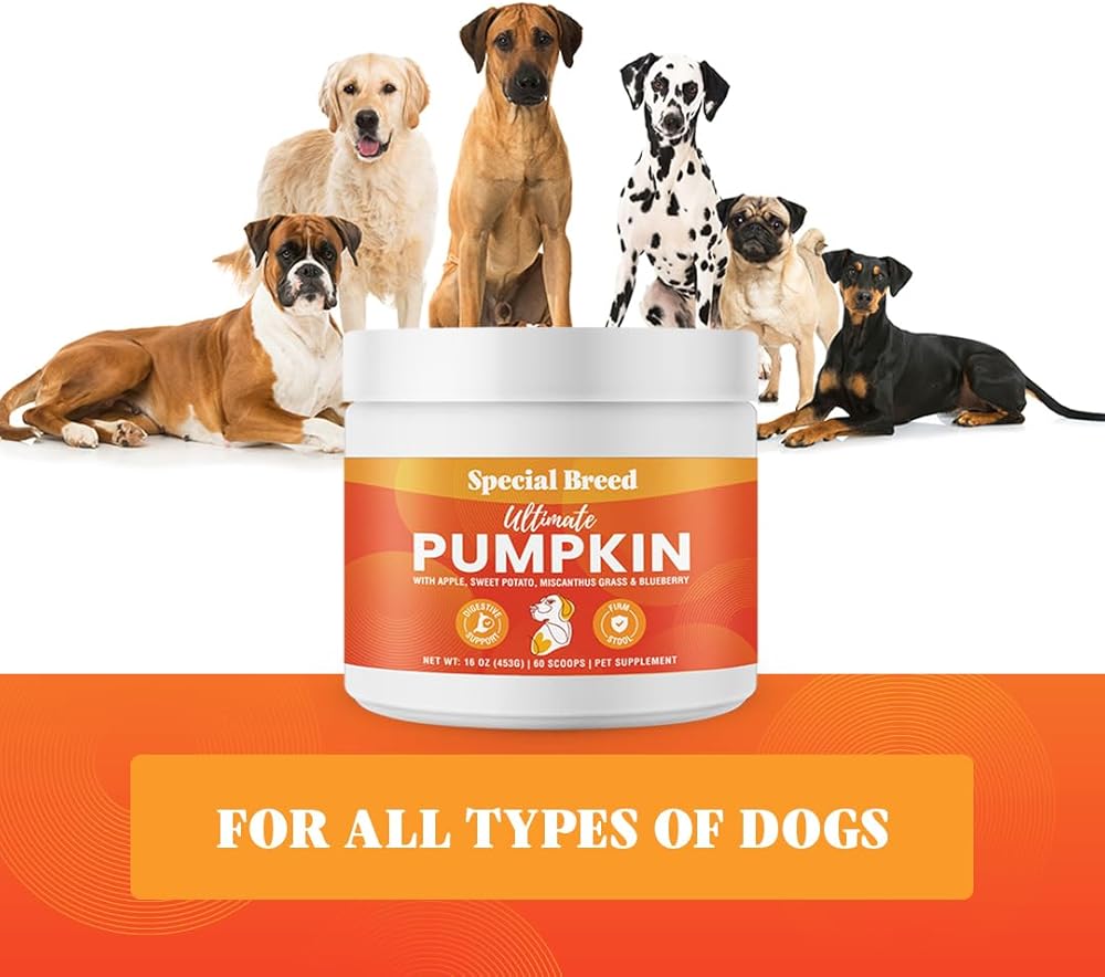 Natural Digestive Support: Our 5-In-1 organic pumpkin powder complex helps with every day gut health. Rich in fiber, this supplement helps with digestive issues, constipation, diarrhea, upset stomach, and helps make poops firm and dogs regular.