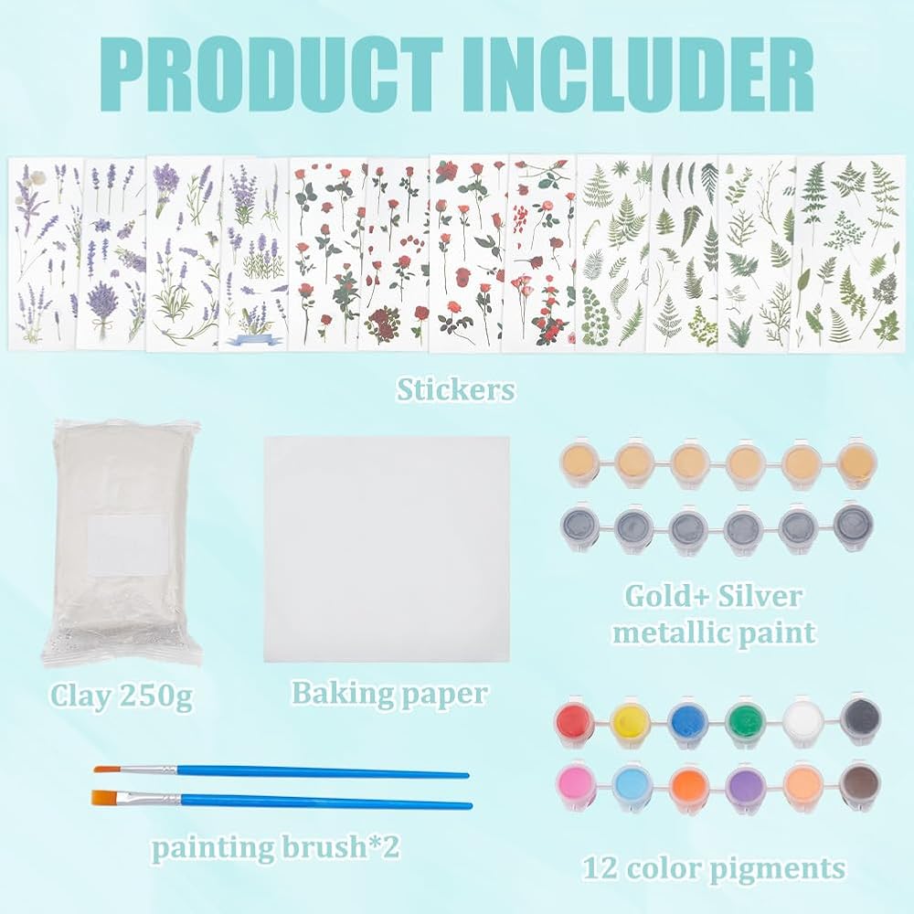 Polymer clay jewelry kit: Our clay making kit is very suitable for DIY making, all clay tools are in a package, include clay*150g, baking paper*1, paint brush*1, 2 color paint (golden, silver), 3 sheets flower sticker and more