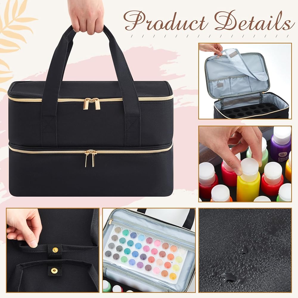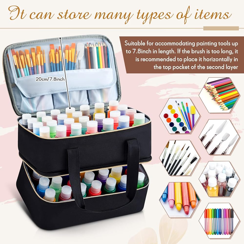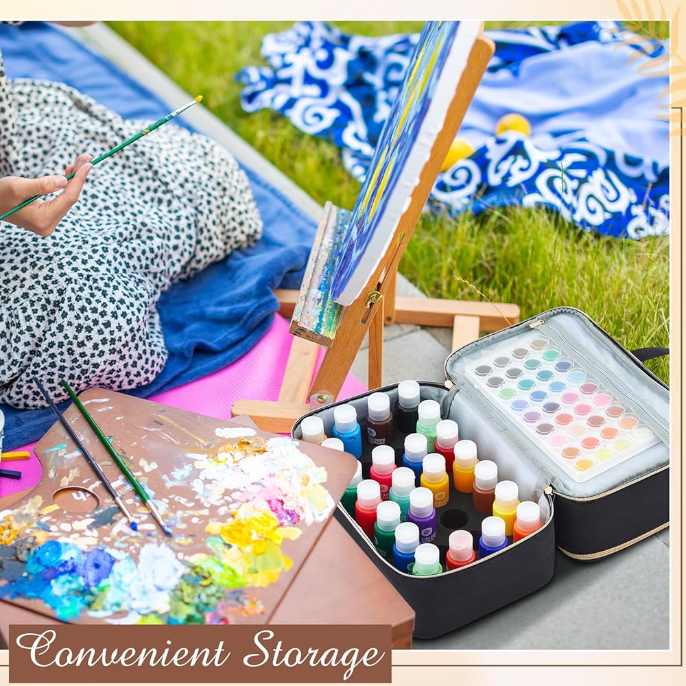 Two in One Compartment Design: each layer of the paint bottle storage bag has 32 independent shockproof foam compartments, a total of 64 in two layers, which can accommodate paint bottles with a diameter of 1.38 to 1.5 inches to prevent acrylic paint bottles from rolling and spilling into the box; EVA material and inserted foam provide dual protection for your paint bottles