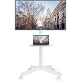 SIMPLE MANOEUVRABILITY: Equipped with four heavy duty 360° lockable casters, this TV cart ensures easy transportation across different floor types. Whether you need to move it on hardwood, tile, or carpet, the robust casters glide smoothly. The built-in locking mechanism allows quick switching between mobile and stationary modes, offering effortless movement and stable positioning, making it highly adaptable for various TV placement needs.