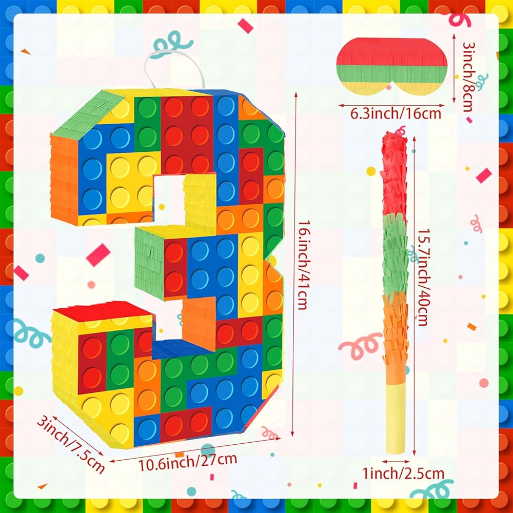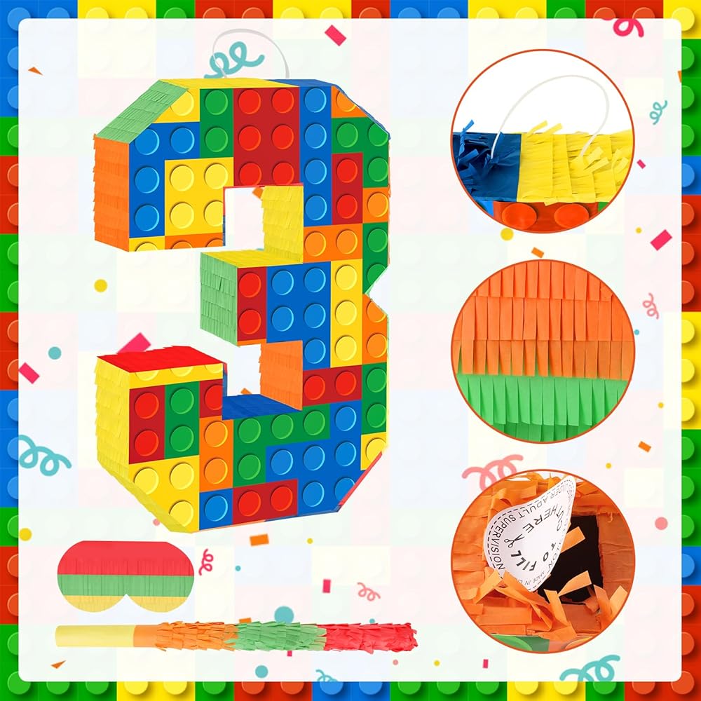 Building Blocks 3rd Birthday Party Decorations Number 3 Pinata with Pinata Stick & Blindfold for Kids Girls Boys Happy Birthday Building Block Theme Party Supplies Carnival Games