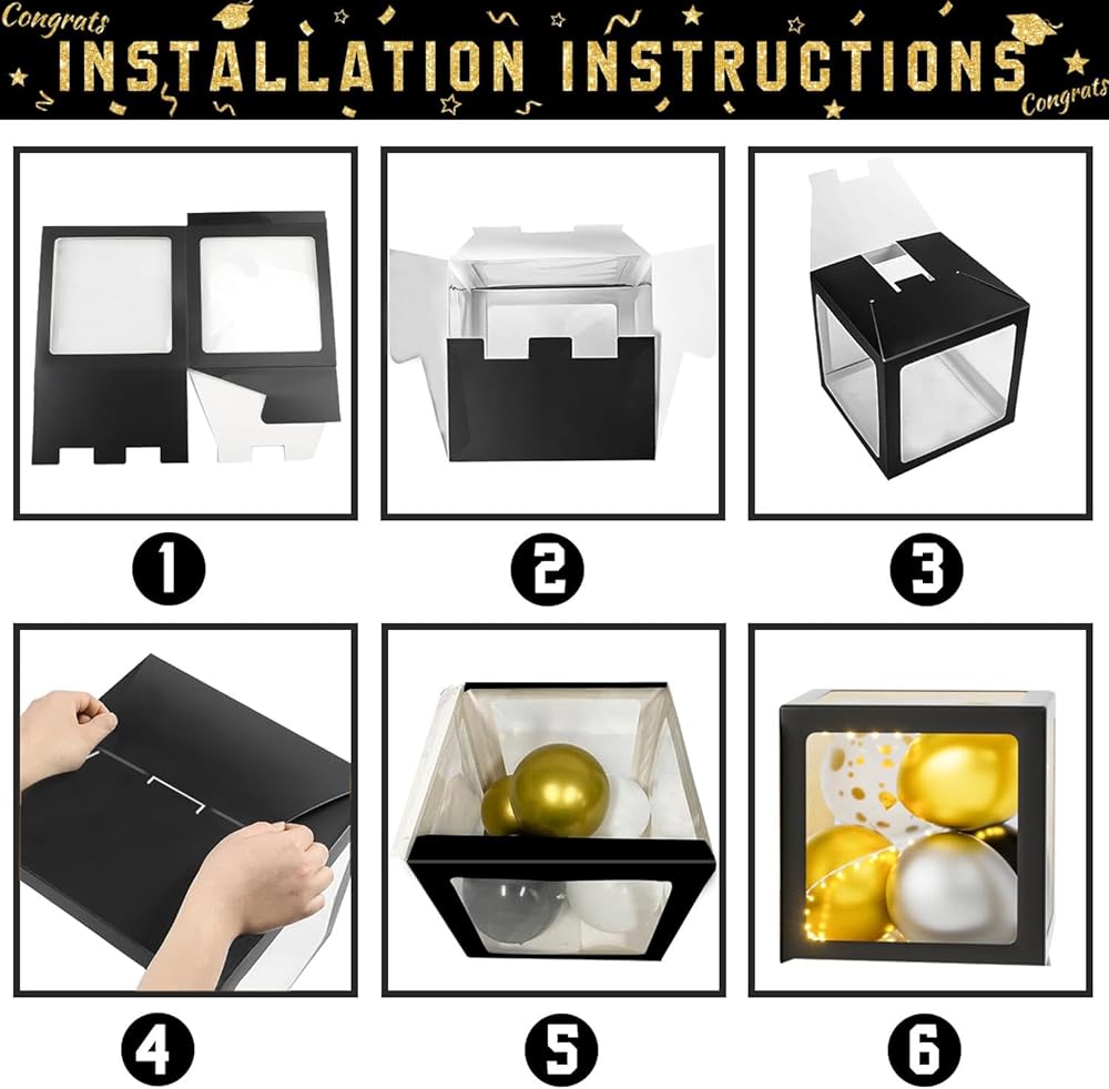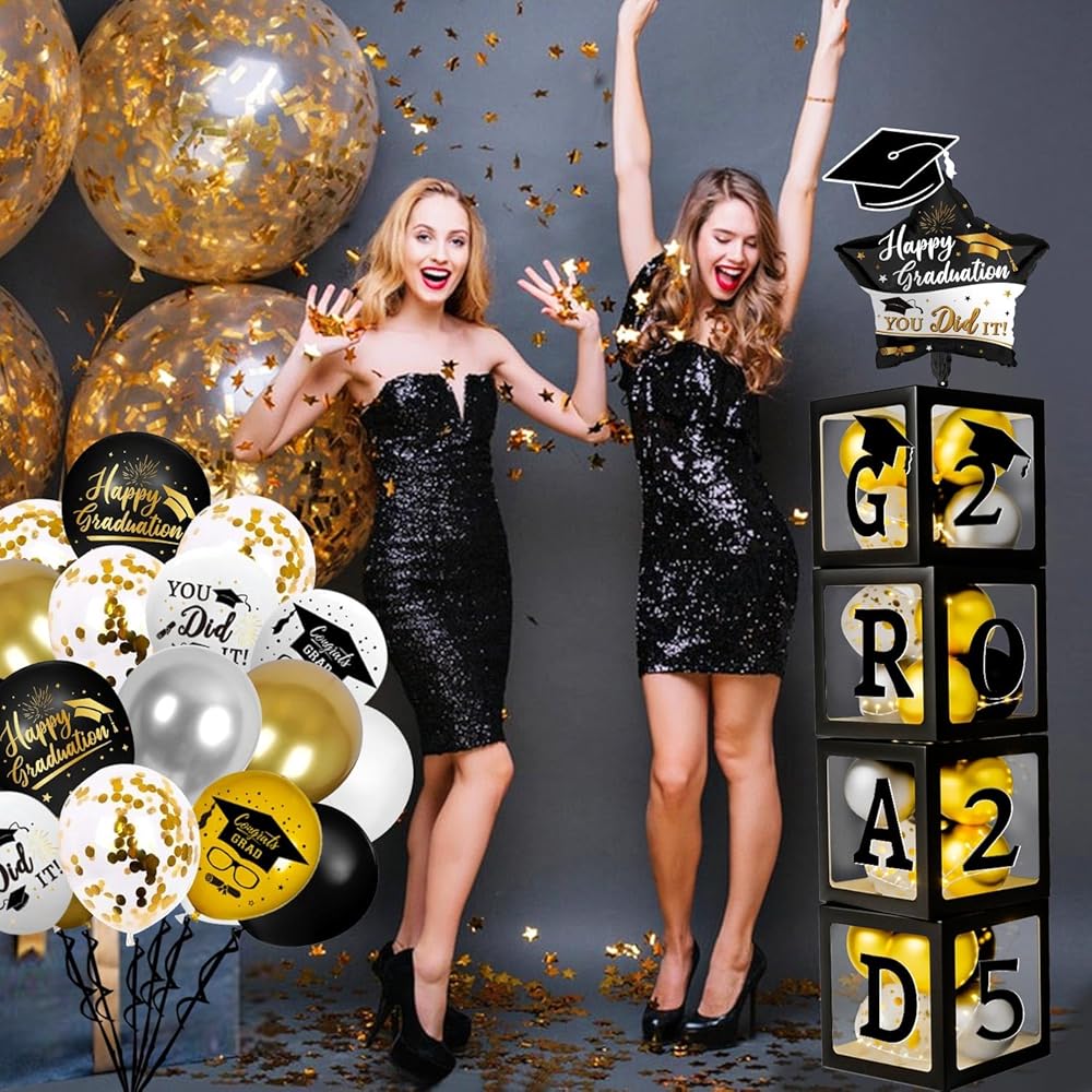 Safe & Durable Material: The graduation boxes are made of high-quality paper, ensuring durability, easy cleaning, dirt resistance, and foldability for various occasions. Graduation balloons, crafted from natural latex, can be filled with air or helium, are NOT EASY TO BURST, and are safe to use