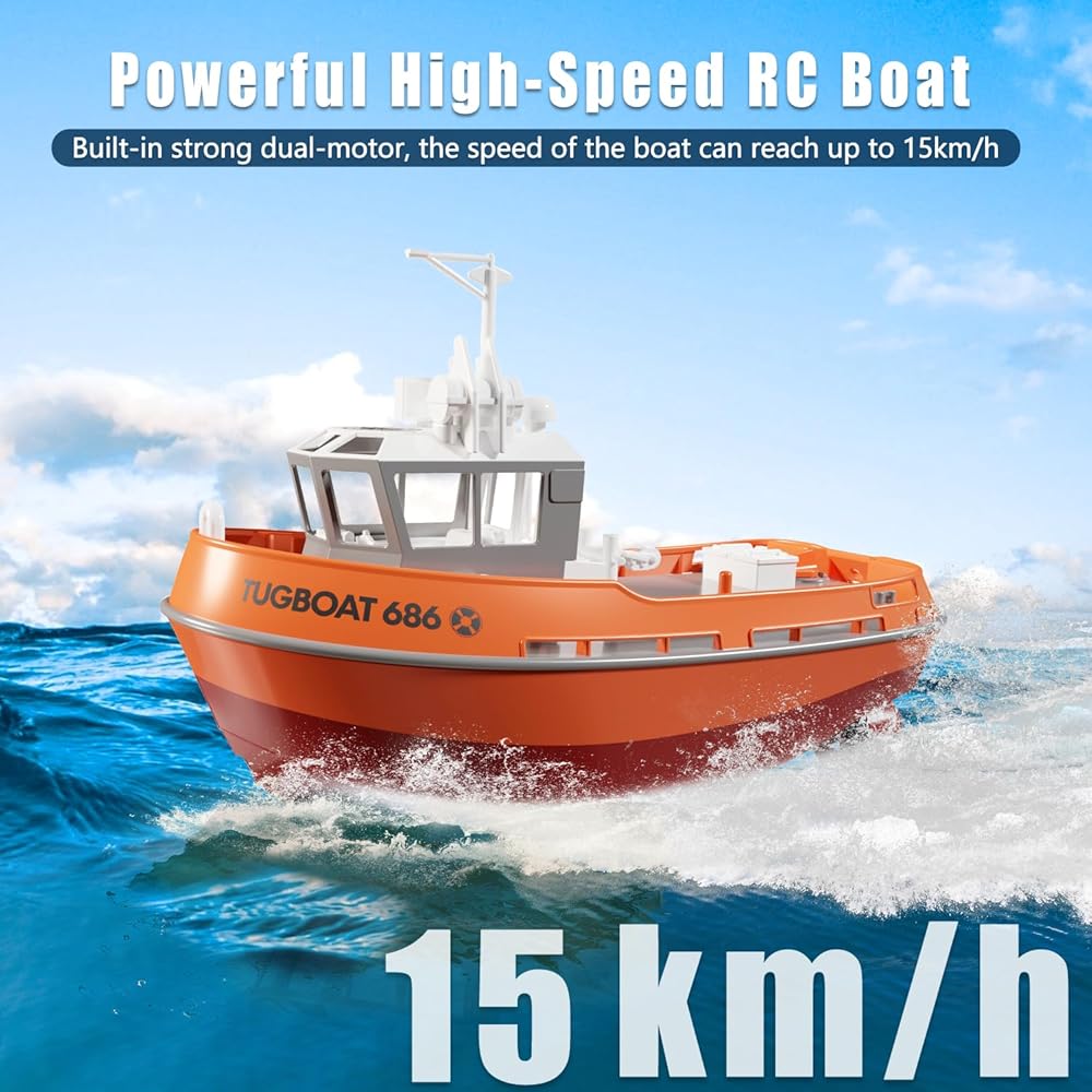 [High-Speed Remote-Controlled Fun]—Equipped with powerful dual motors and twin propellers at the rear, the toy boat's horsepower surpasses that of ordinary motors, reaching speeds of up to 15 km/h (approx. 9.3 mph) for an exhilarating speed experience.