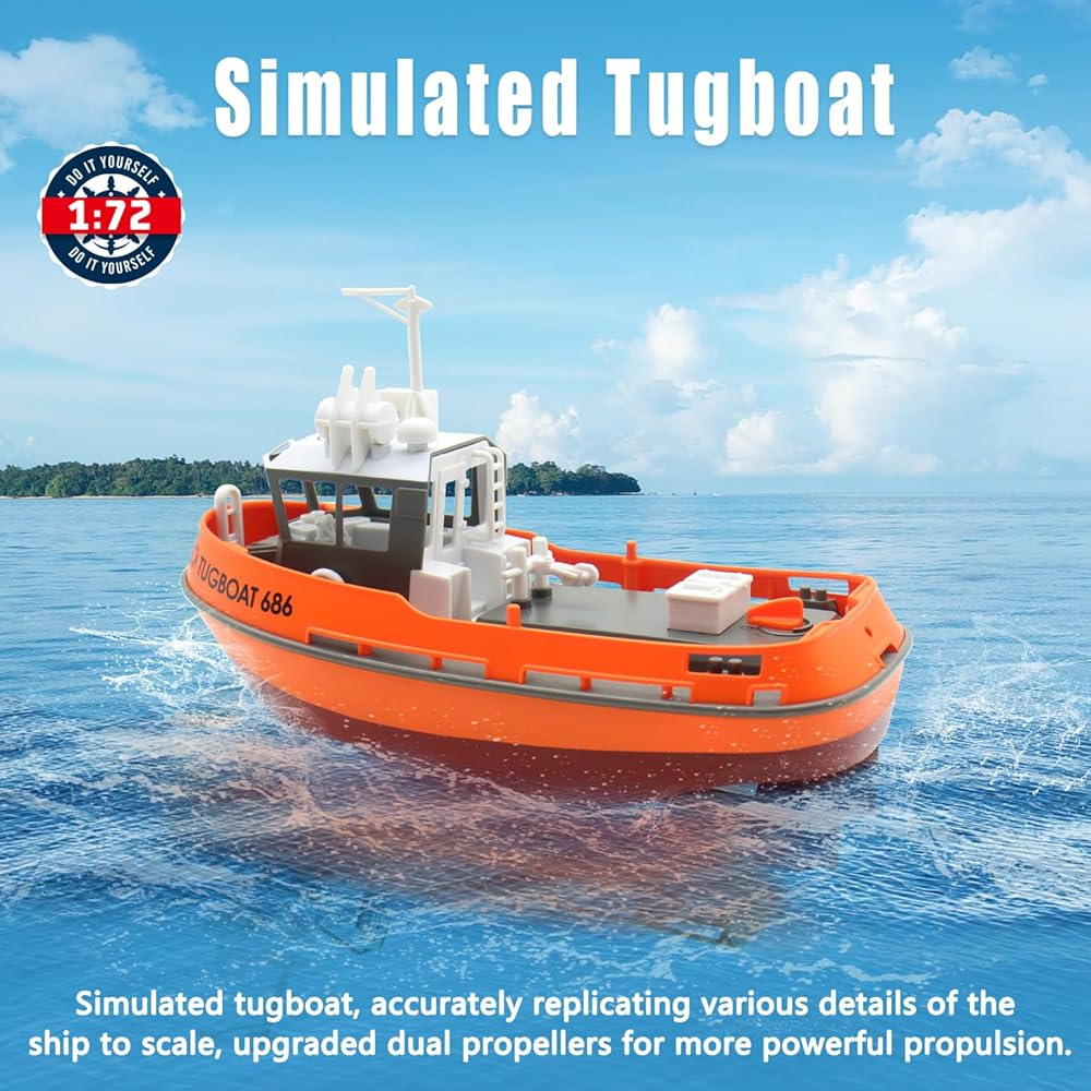 RC Boat, 1/72 RC Tugboat for Pools and Lakes, High-Speed Remote Control Boat with 40 Mins Play Time and Low Battery Reminder for Kids and Adults - RTR Version