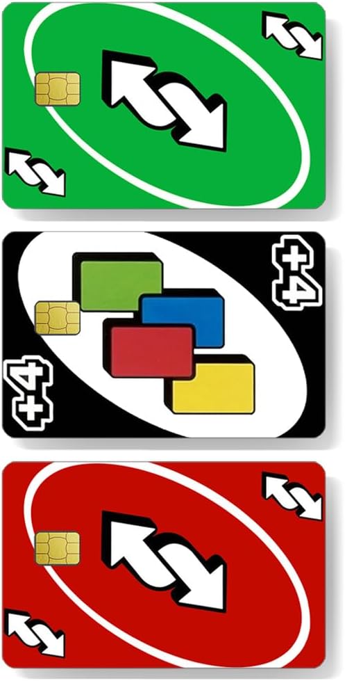 3 in 1 Card Stickers: We provide you with a set of 3 stickers in different colors, Liberate your color selection difficultiesall,all with full cover chips and rectangular microchip pre cut labels, suitable for all types of cards with small chips Personalization Card Skins: By using these Uno Reverse credit card stickers, you don't have to worry about someone stealing your credit card information.Allow you to personalize and protect your credit, debit, or key cards High quality: The debit card cover is made of the highest quality materials and the most durable ink to create printed materials, providing a waterproof barrier to prevent damage caused by liquids or moisture, and has scratch resistance Easy to stick: These bank card stickers are ultra-thin and only 75 micron thick, waterproof and scratch resistant. And will not affect the use of ATMs or various payment methods.They can be pasted in a few seconds without the need for complicated adhesive. If they are not pasted correctly the first time, they can be repositioned As a gift: There are dozens of card stickers for you to choose from, as a gift for your family, husband, wife, friends, colleagues, and your closest loved ones. Add fun to boring and ugly credit cards