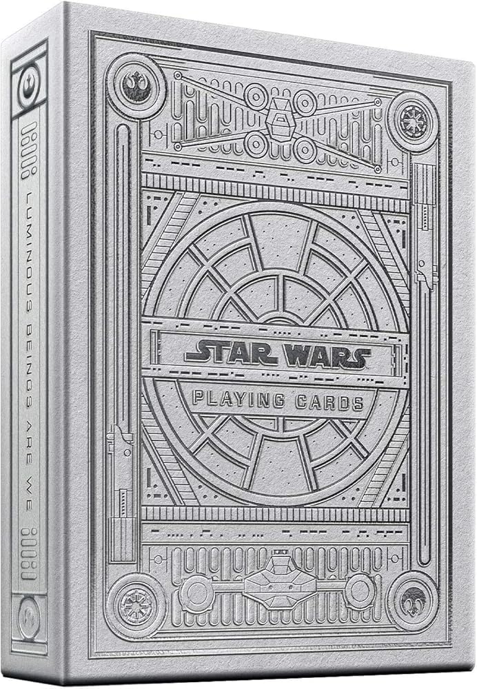 Since 1977, Star Wars has been a pop culture phenomenon. In collaboration with Lucasfilm, theory11 is proud to present Star Wars: Light Side and Dark Side Playing Cards - now in a new special Silver Edition. Available in two colorways - stunning white (Light Side) and gunmetal grey (Dark Side). Channel your inner Sith, join the First Order, or maintain order in the galaxy alongside Emperor Palpatine's Imperial Army. The Dark Side deck features Darth Vader's lightsaber, the Death Star, and the Empire's fleet of starships. “You don't know the power of the dark side! ” On the front of the dark side box, look through the window of the Imperial Throne Room, with symbols of the Galactic Empire and First Order on each corner. Both edition decks feature the same set of 12 court cards, representing each side. On the dark side, Palpatine is depicted alongside Kylo Ren, Darth Vader, and more. On the King of Spades, Darth Vader is depicted holding his lightsaber while taking command of his Imperial subordinates. “I find your lack of faith disturbing. ” Across the gunmetal grey back design, it's all about the details - from the Death Star to the First Order, Sith, and Empire insignia. In the center, a repeating pattern of TIE fighters supports Darth Vader's lightsaber on either side. The cards themselves are made in the USA - printed on FSC-certified paper derived from sustainable forests, vegetable-based inks, and starch-based laminates. Choose your destiny.