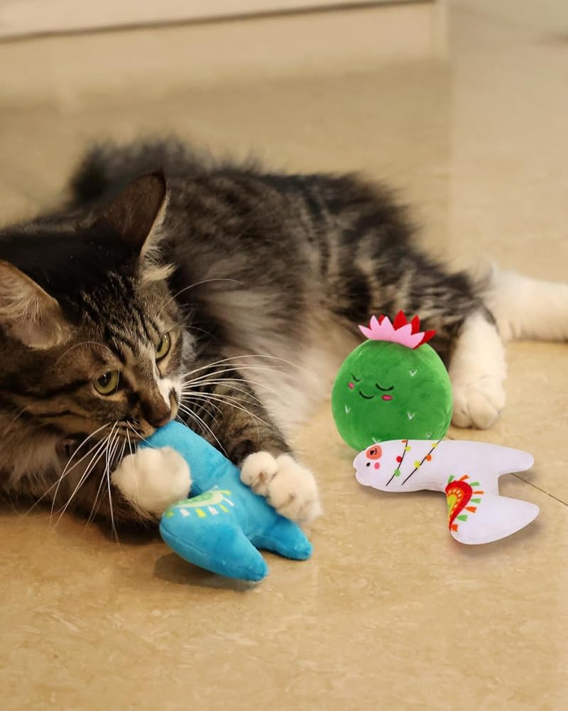 Quality Sustainable & Safe Material - Made of soft plush flannelette. Crafted in the shapes of birthday-themed supplies and hand sewed with color-matched thread and filled with cotton that ensures these kitten toys are more sustainable and suitable for teething, chewing, kicking, or playing.