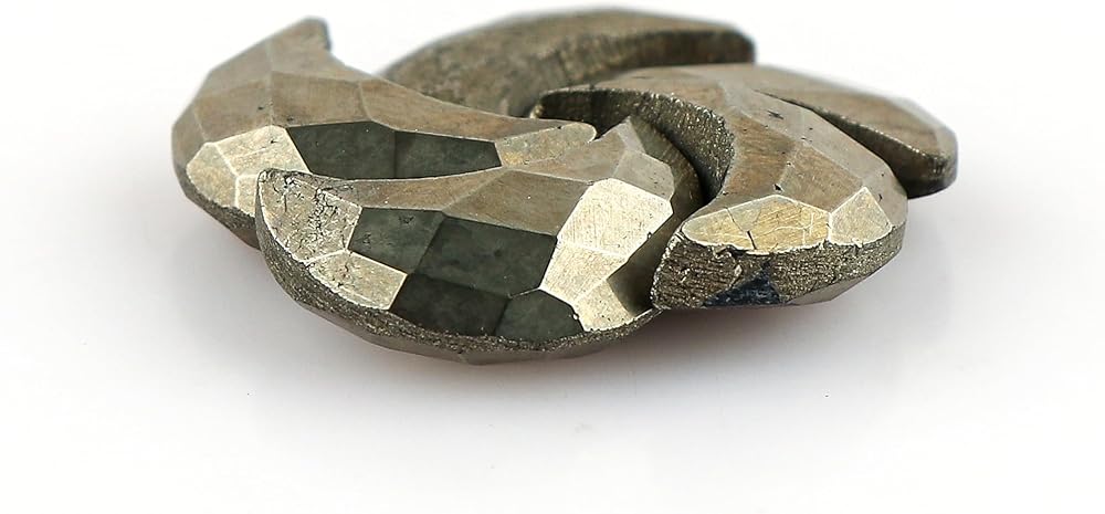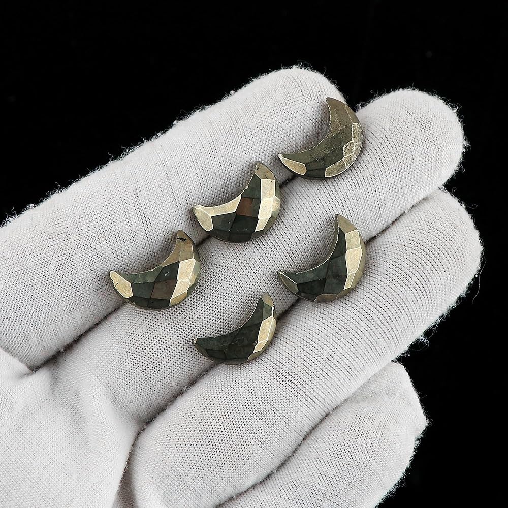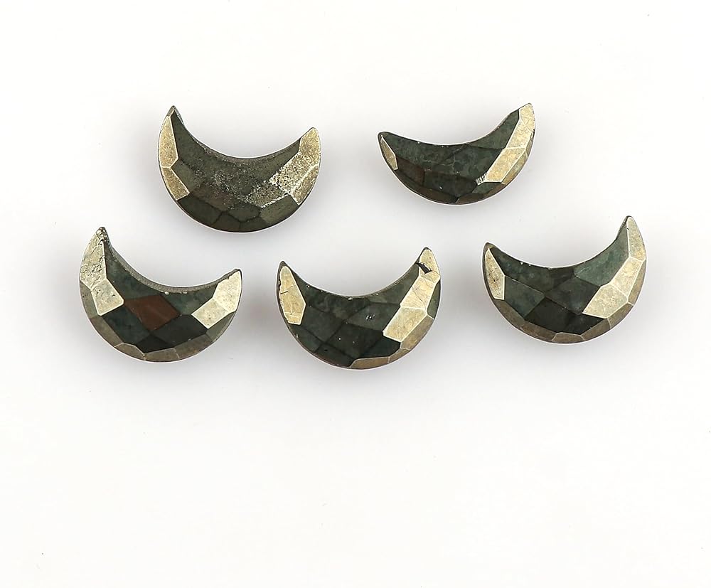 🟢 "Golden-Pyrite Crystal Facet-Half-Moon Loose Stones for Jewelry Making" - what comes to a mind when you see this nature's beauty. We absolutely believe that you will fall in love with these piece. These loose gemstones have chakra healing properties. These loose polished cabochon crystals comes with beautiful 5pcs with a elegant box. The Amazing Pyrite Crystals are mined from India and you may got these crystals between 16x11mm approx size in Facet-Half-Moon form.