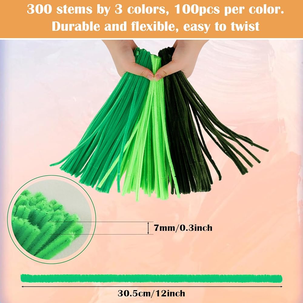 You Will Get: 300pcs chenille stems by 3 colors(green, red and yellow), 100pcs per color. Each stem is 12 inches long and has a diameter of 0.3 inches.
