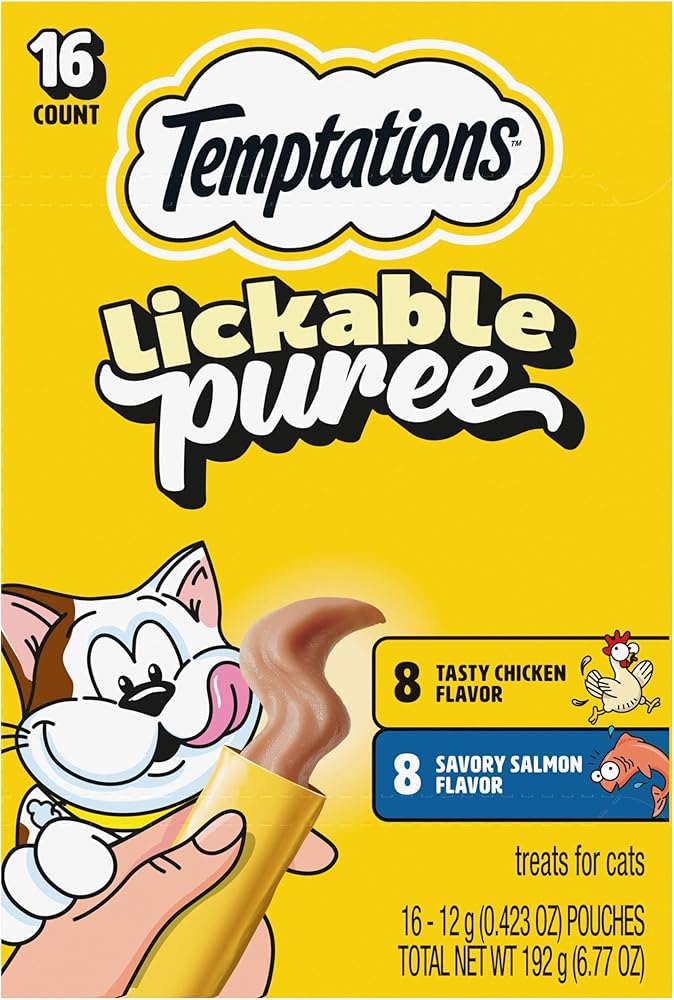 Treat time is your cat's favorite time of day. Make it even more purr-fect with Temptations Creamy Puree Mix-Ups Squeezable Lickable Wet Cat Treats Seafood Medley Flavor. These irresistible and squeezable wet cat treats deliver the delicious real shrimp and real salmon taste cats love in the perfectly creamy texture they can't get enough of! Serve these lickable cat treats by hand for a playful bonding moment, in a bowl as a cat snack, or as an extra special cat food topper to make mealtime fun! The possibilities are endless with this interactive cat treat! Plus, these lickable wet cat treats come in a single-serve cat treat tube for convenience…just open, squeeze, and serve! Temptations Creamy Puree has no added sugar, fillers, or artificial preservatives, though trace amounts may be present due to potential cross-contact during manufacturing. Whether your furry friend is an adult or senior, these fun squeezable wet cat treats are the perfect cat snack at less than 15 calories per pouch. We're paw-sitive that your cat will enjoy the delicious taste of Temptations Creamy Puree Mix-Ups Squeezable Lickable Wet Cat Treats!