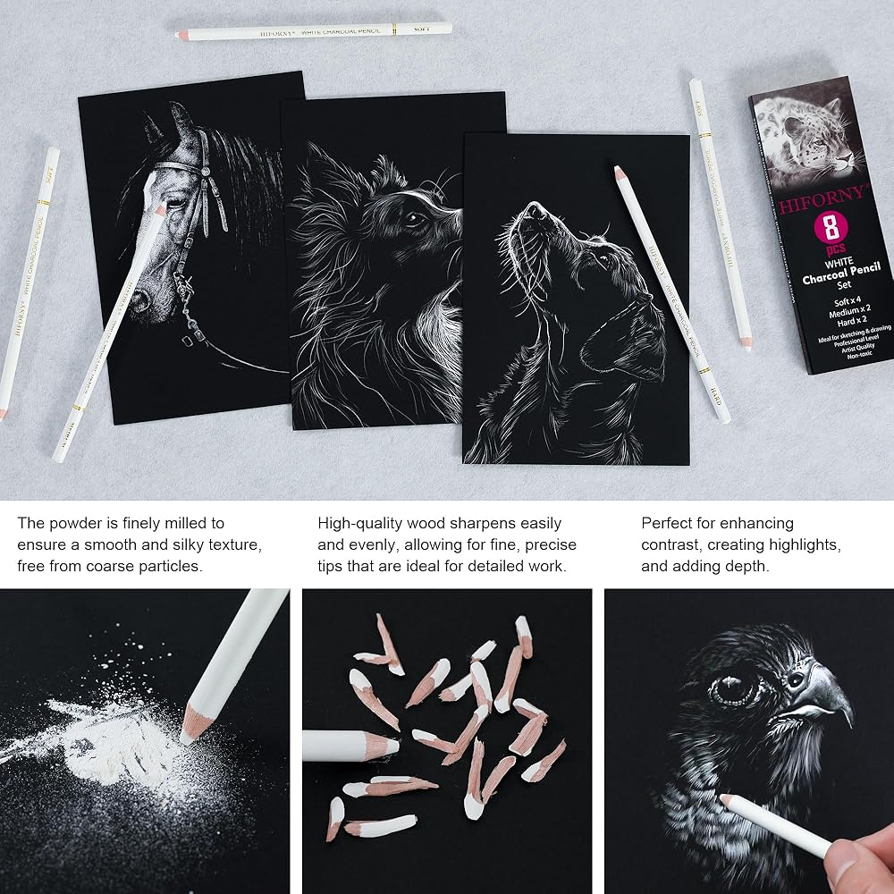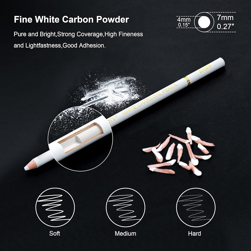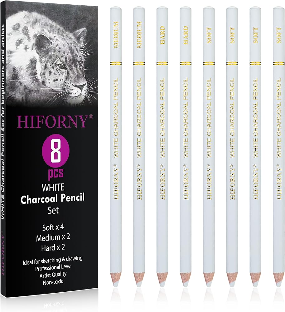 【Complete Charcoal Pencils Set】HIFORNY 10 Pieces Charcoal Drawing Set offers a range of colors specifically selected charcoal pencils,including 3 pcs white charcoal pencils,1 pcs brown charcoal pencil and 1 pcs suntan charcoal pencil,5 pcs black charcoal pencils(3 pcs Soft,1 pcs Medium,1 pcs Hard).Soft,thick,ultra smooth cores are perfect for shading and deliver an even color laydown.