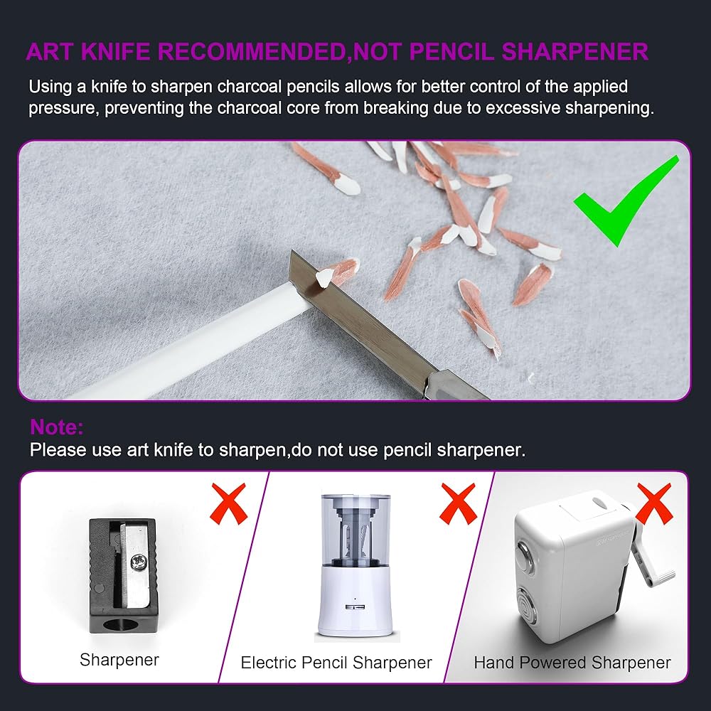 【Premium drawing pencils】Crafted from high-quality flexible charcoal and soften basswood,these charcoal pencils are made to last.They are easy to sharpen,break-resistant,and provide rich lines and shadows,making them ideal for detailing,sketching,drawing,shading,and blending.