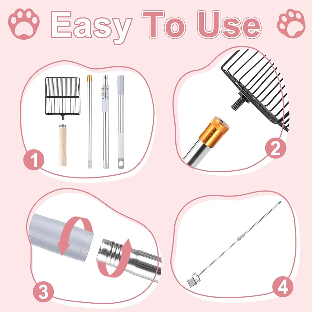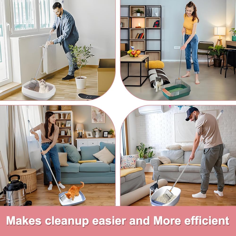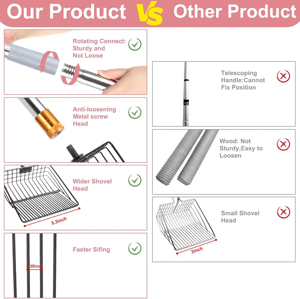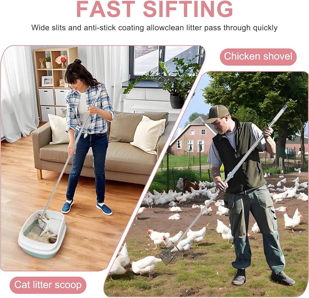 【Adjustable long handle】The length of the cat litter scoop handle can be adjusted between38inches and 57 inches. It is also equipped with a wooden short handle and long handle to keep you away from cat feces, reduce the pressure on your back, and make this stainless steel garbage spoon easier to handle cat feces.