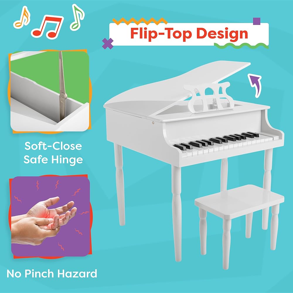 ACCESSORIES INCLUDED - This set includes a music stand, song book, key stickers to promote proper finger placement, a matching bench seat, and a lift top lid with soft-close hinges to mimic the look, sound, and feel of a standard grand piano.