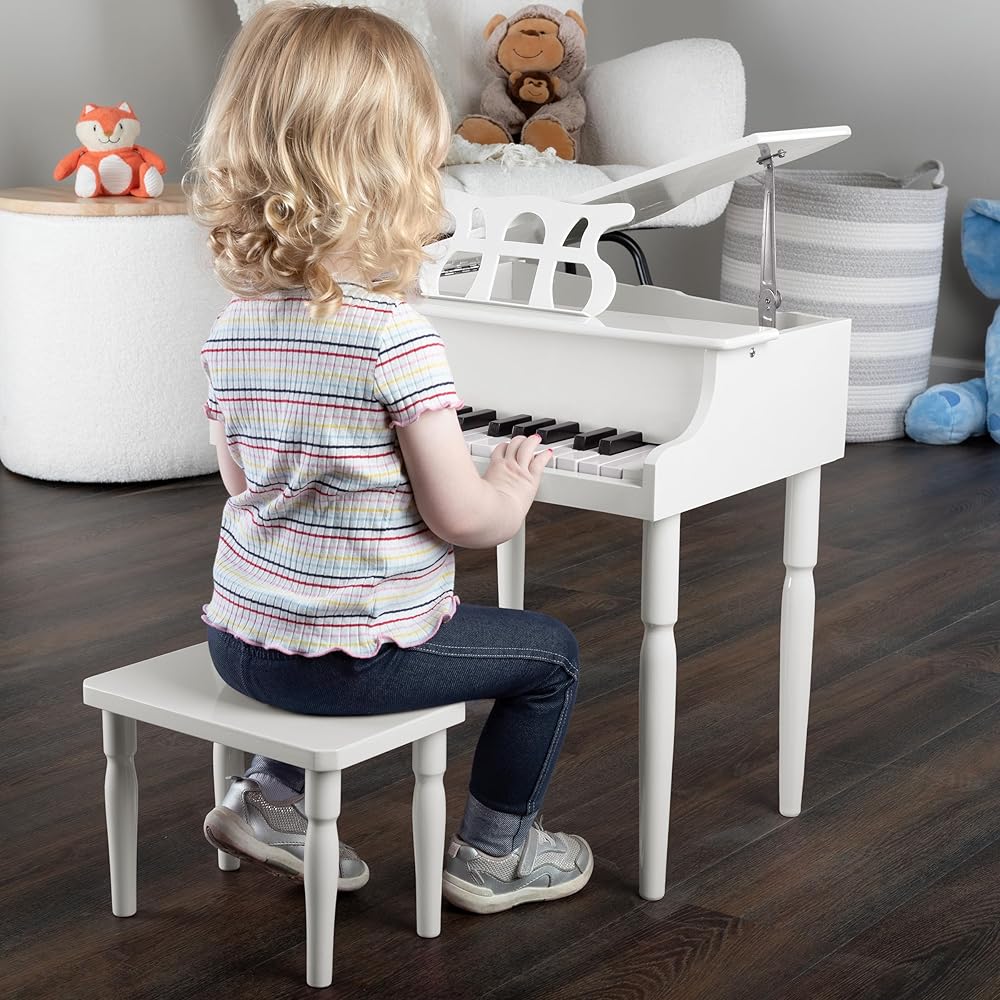 EASY TO CLEAN - The glossy coating on the kid piano and bench as well as the detachable music stand make it simple to wipe them down with a damp cloth and let air dry for easy cleaning. This mini piano for kids makes a great gift for any occasion.