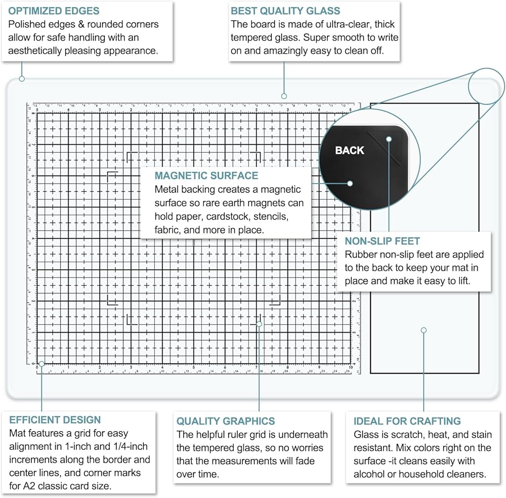【ALL-IN-ONE TEMPERED GLASS CRAFTING SURFACE】Our Magnetic Glass Craft Mat is the ultimate crafting surface for all your creative projects. Made with high quality tempered glass, this mat provides a durable and smooth surface for cutting, stamping, mixed media art, heat embossing, and hot glue projects.