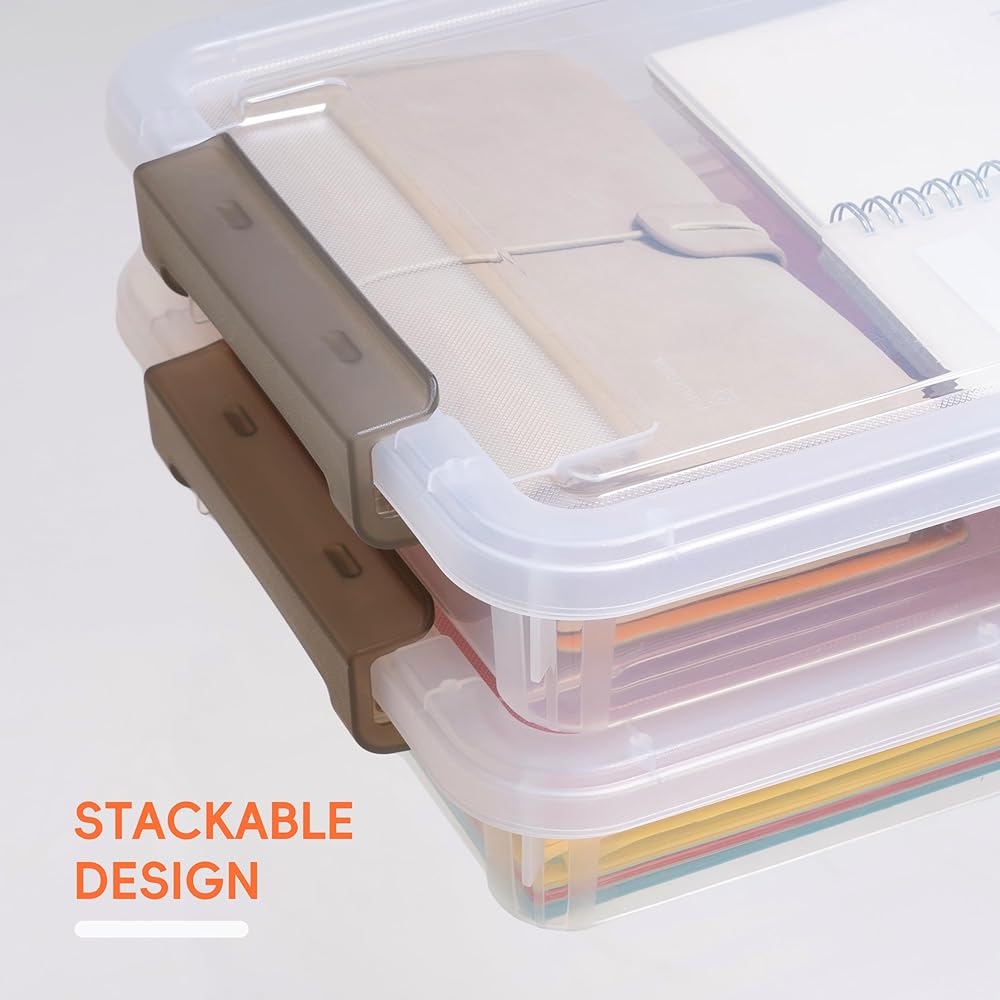 SIZE: The plastic organizer box measures approximately 14.65'' x 10.43'' x 2.87'' with a 5 quart capacity,inner size 12.48'' × 8.98'' × 2.87'' perfect for protecting your photo greeting cards or important office documents. Each box is large enough to hold up to 550 sheets of A4 paper