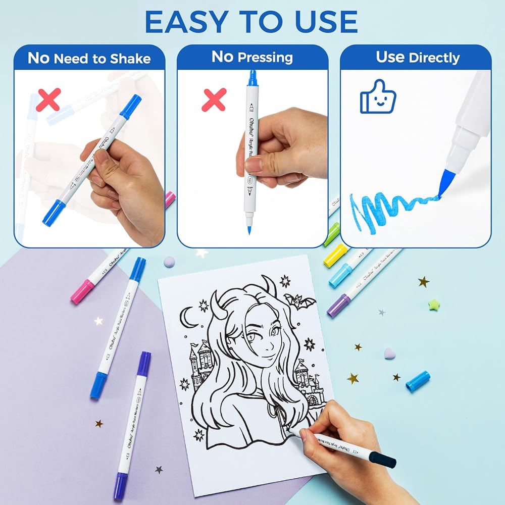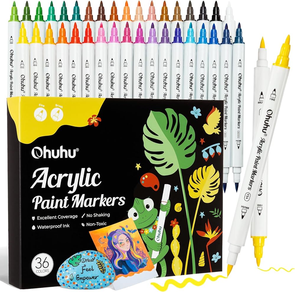 36 VIBRANT COLORS: Ohuhu acrylic paint pens set features 36 stunning hues with even distribution and smooth transitions, perfect for a variety of painting and writing styles. With exceptional coverage and color performance, these paint pen deliver brilliant shades that stand out even on black backgrounds.