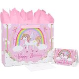 Oltex 13" Large Happy Birthday Pink Paper Bags,Pink Gift Party Favor Bags with Tissue Paper Birthday Card for Girls Women' Party,Baby Shower