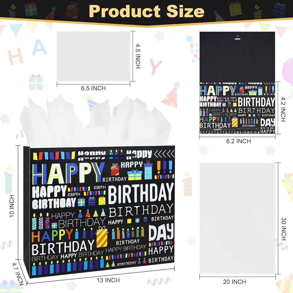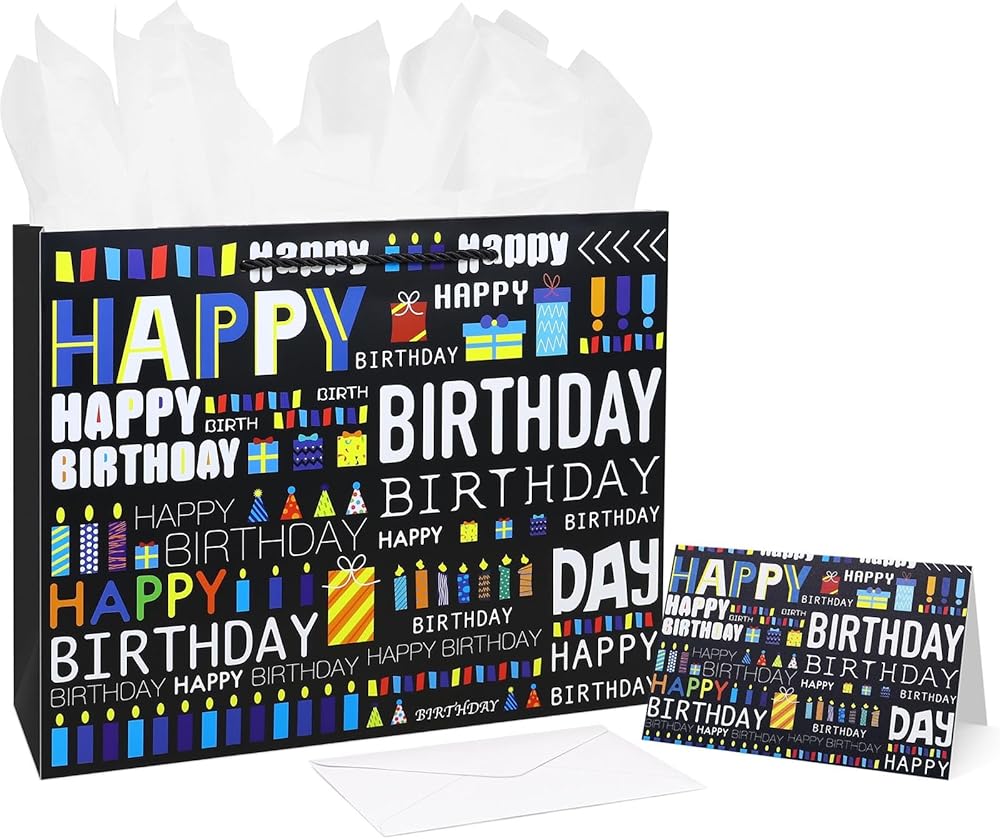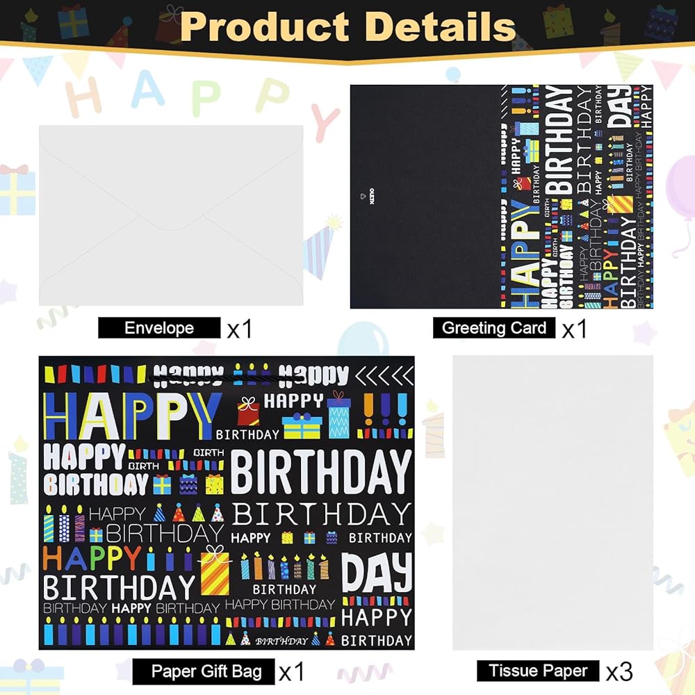 Oletx 13" Black Letter Party Gift Bags Happy Birthday Gift Paper Bag with Tissue Paper Greeting Card for Father's Day,Men' Birthday Party