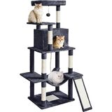 NTERESTING LAYOUTS: Ample room and reasonable layout ensure your cat a comfortable and interesting experience. Your cute cat can hide in the condo, sleep on the lower hammock, and enjoy the scenery on the top perch. The scratching posts, a ladder, a hanging ball, and rope will bring him/her more fun
