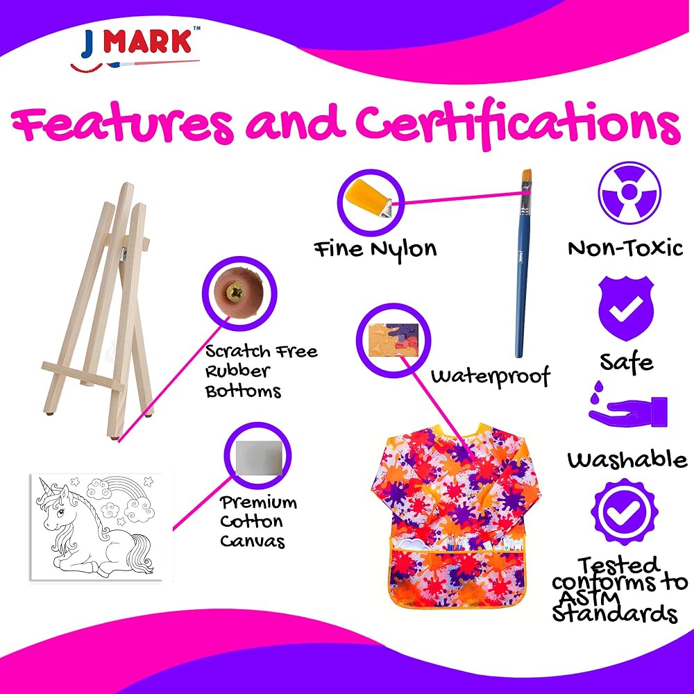 Features safe, washable acrylic paints in 12 colors that conform to ASTM standards; Paints blend smoothly on included 8 x 10" castle, unicorn, butterfly & flower themed canvases