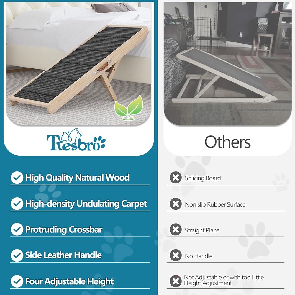 Adjustable and Versatile: Tresbro's adjustable dog ramp come in different styles according to different dog breeds and usage scenarios. This 40 inch long ramp for dogs has four adjustable heights( 11'', 14.17'', 17.32'', 20.47''), and a wide range of applications. It is suitable to be a dog ramps for small dogs and is applicable for most sofa, couch, and some cars.