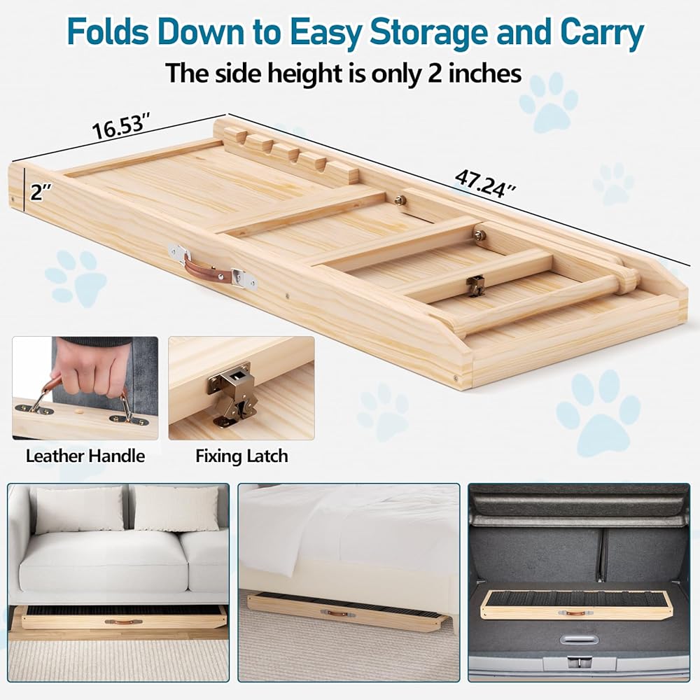 Portable & Easy to Use: This ramp adopts a pre-installed structural design, it only takes a few seconds to arrange the brackets on the back of the ramp according to your own need. The 2-inch storage height of the doggy ramp is sufficient to place it under the sofa and bed, paired with a leather handle on the side, making it a breeze to take with you on trips or move around the house as needed.