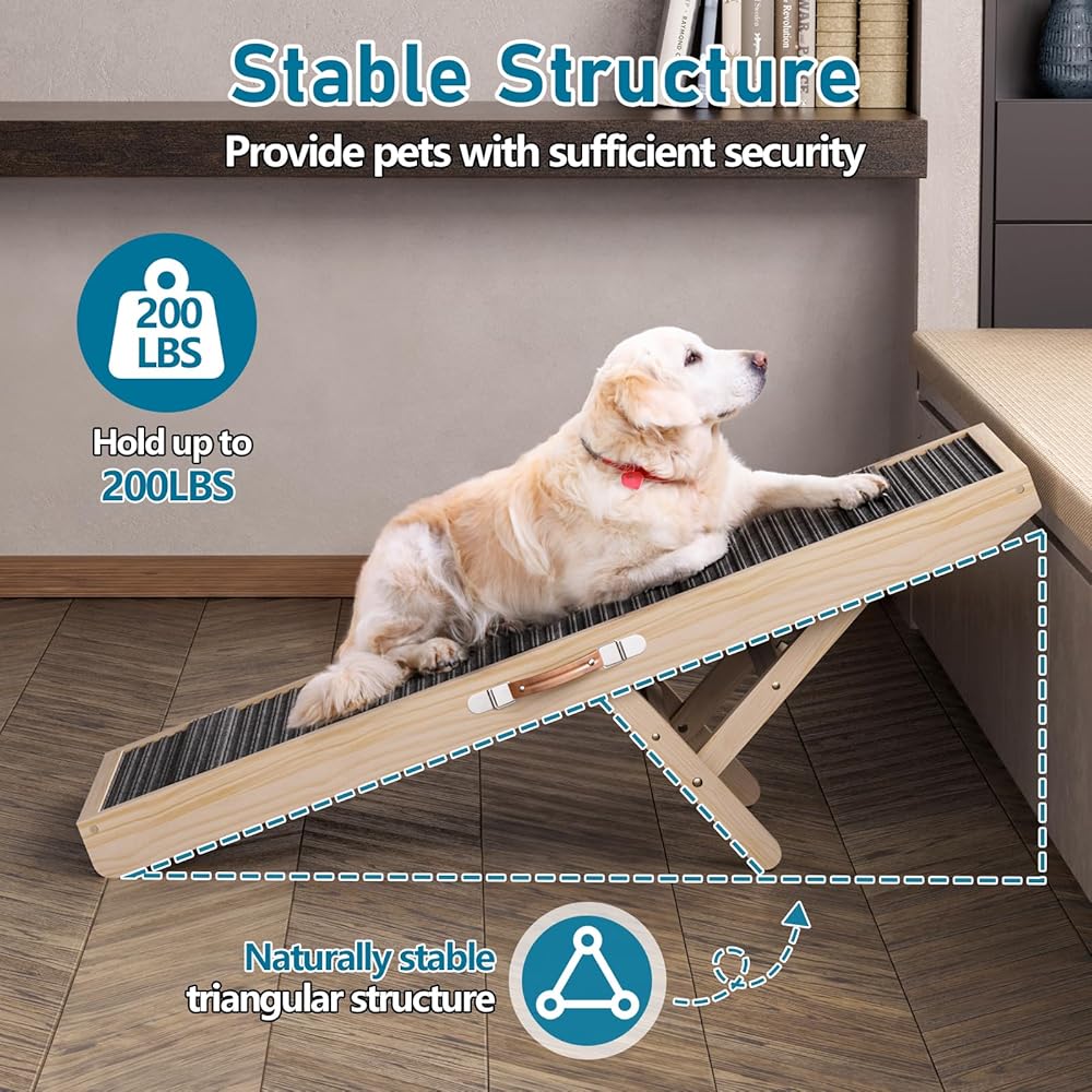 Premium Quality: Crafted from high-quality natural solid pine wood, each ramp for dogs is made of a single straight board instead of jointed wood, ensuring its high quality by source factory. Through processing, dog couch ramp has a bright color and smooth surface without burrs. Each dog bed ramp has undergone drop and wear resistance testing, and after repeated trampling, the dog ramp for couch can bear up to 150 pounds, providing strong support.