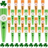 The package includes 24 kazoos in light green and orange with distinct shamrock stickers. Each kazoo is individually packed in a clean OPP bag, making them ideal for gifting, sharing as party favors, and doubling as festive decorations.