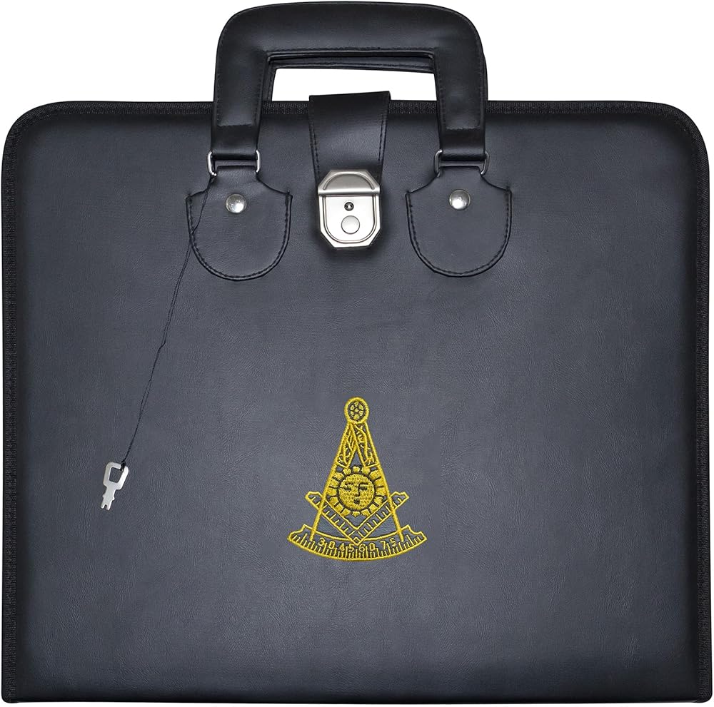 Discover our Premium Quality Masonic Past Master Apron Case, crafted from premium black imitation leather. Comes with a moveable handle, front lock and key for added protection. Machine embroidered PM emblem. Inside soft padded blue fabric lining, along with elastic straps and connector in the top compartment to securely hold your regalia aprons. The bottom part features two spacious pockets, one with zipper openings for additional storage. Size: at 17'' x 15.5'' x 1.5” suitable MM/WM and Provincial aprons.