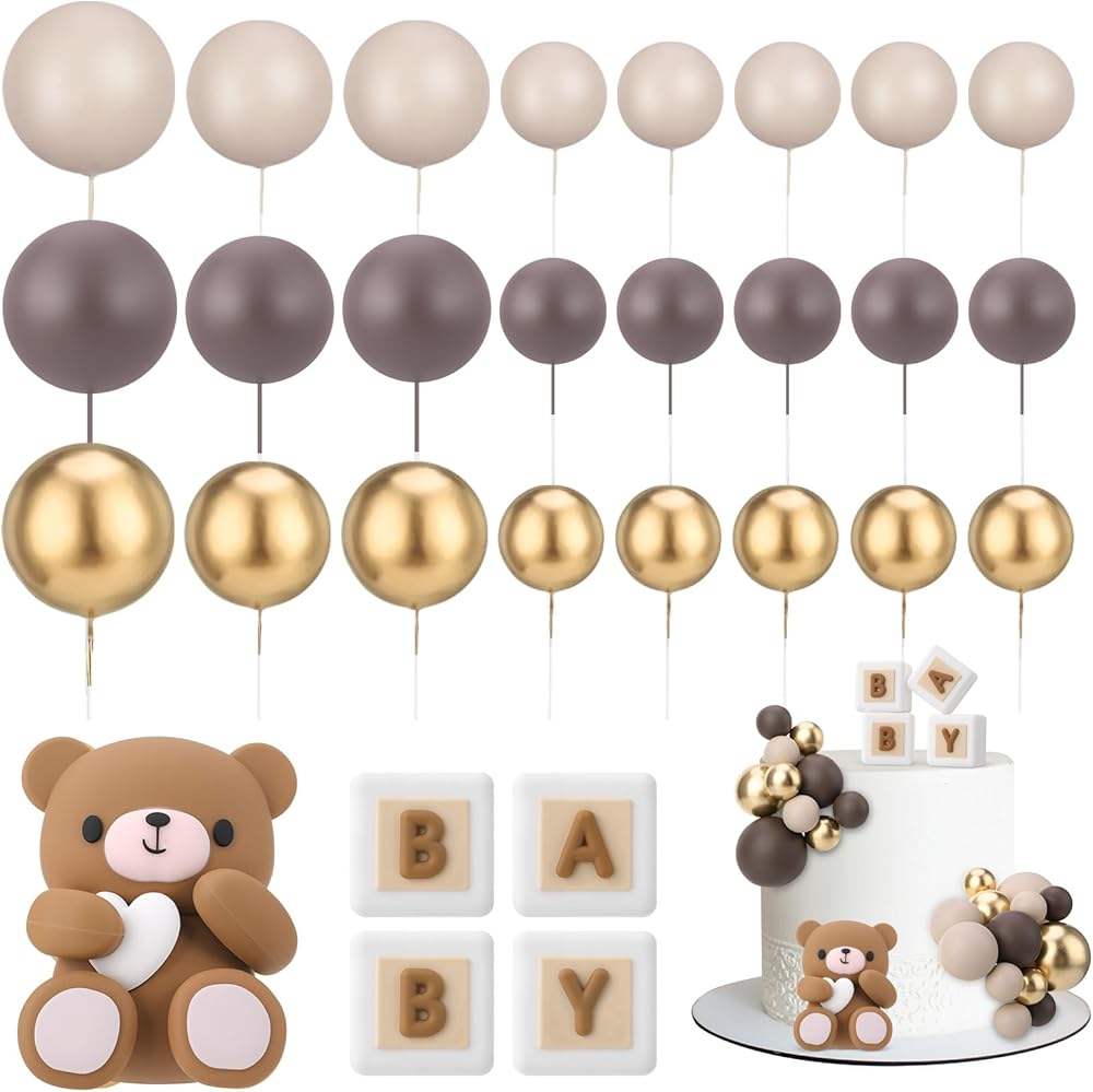 Package Included:You will receive 24 pcs mini balls cake topper in 3 colors,4 pcs BABY printed ornaments and 1pcs cute bear cake toppers ornament. Rich balls cake toppers combination decoration can meet your needs