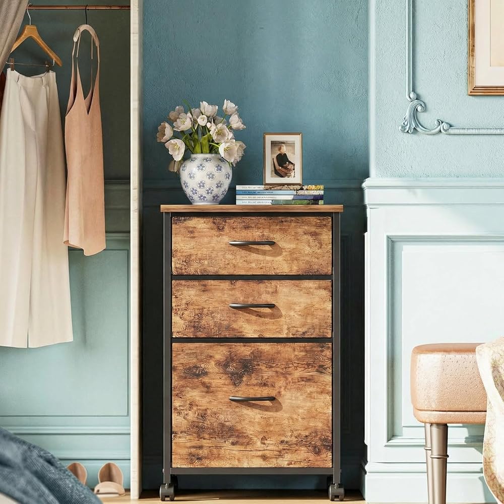 Easy to Move: Rolling on 4 wheels, this mobile file cabinet can fix or move around your home office freely. Built-in brakes on front 2 casters to keep it in position and add stability. Unique fabric drawer design makes it only weigh 22 lbs. and light to move.