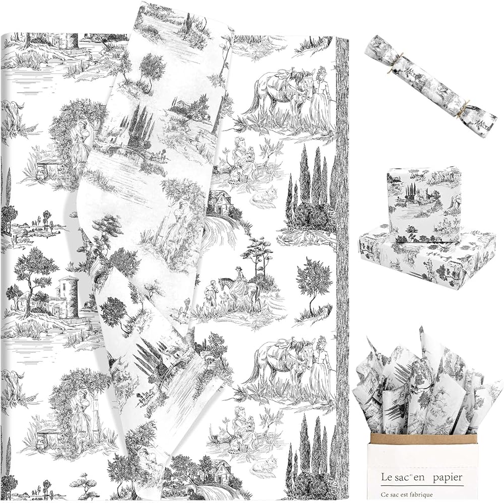 100Pcs Black and White Vintage Tissue Paper French Rustic Tissue Paper for Gift Bags Antique Toile Tissue Paper for Gift Wrapping Decorative Tissue for Birthday Party Bridal Craft Supplies (Black)