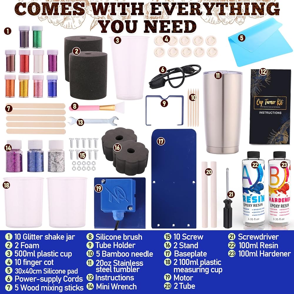 【ENJOYABLE CREATIVE GOOD-VALUE FULL KIT】Our cup turner kit is specific designed for people who love DIY with epoxy resin, It is a fun creative DIY cup turner activity With everything including Resin and Hardener, Glitter shake jar, Silicone brush, Silicone pad, Finger cot, Plastic cup and measuring cups, Bamboo needles, Wood mixing sticks, Baseplate, Motor Part, Tube holder, USB, Tubes, foams, Screwdriver with screws, Mini wrench, Stainless steel tumbler, Stand, Sequin and Instruction.