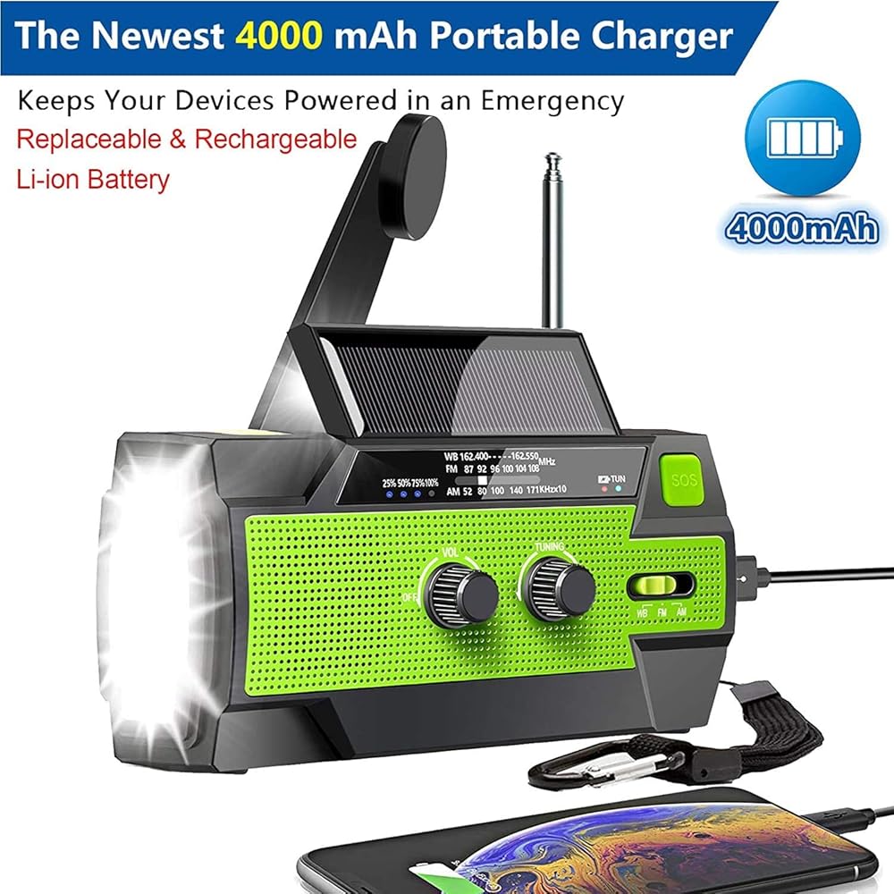 【4 CHARGING MODES】The weather radio has upgraded to 4000mAh replaceable Li-ion battery. Micro USB charges, Solar charges, Hand-crank could also supply the flashlight radio last for days after the storm had passed until the power back on.this hand crank light never runs out of electricity! SOS alarm ready to go when you need it most