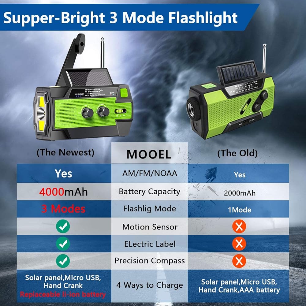 【2023 Upgraded】Emergency Solar Hand Crank Radio, 4000mAh Portable Weather Radio, AM/FM/NOAA, 3 Gear LED Flashlight, Motion Sensor Reading Lamp, Phone Charger, SOS Alert & Compass for Home and Outdoor