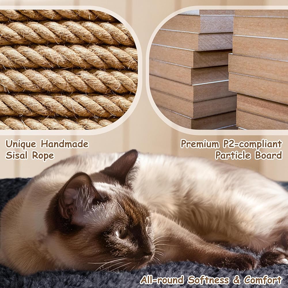 PLUSH AND DURABLE: This cat tower is made from selected materials, ensuring unparalleled strength and longevity.. Plush cover and solid P2 boards provide your cat with extra comfort and strong support. To keep the cat tree stable, we add an anti-toppling strap on the condo