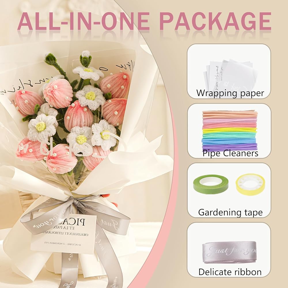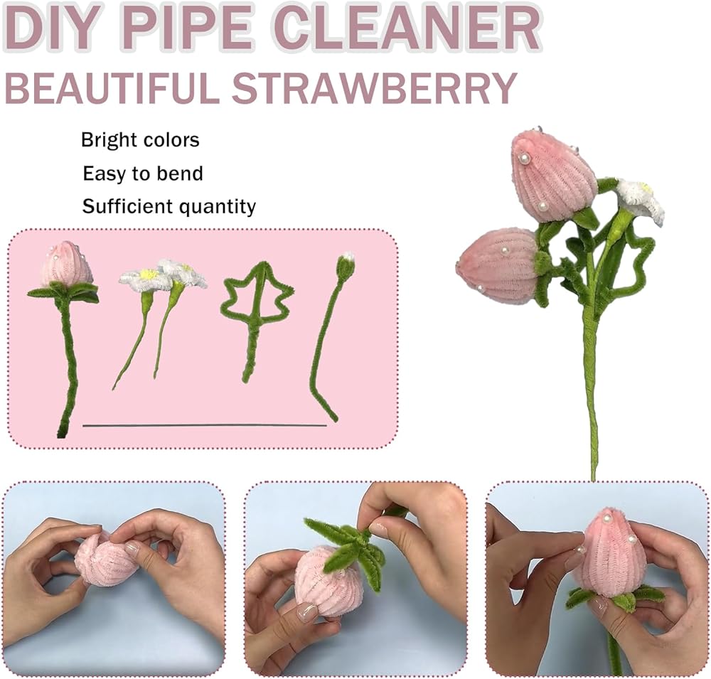 【Strawberry Bouquet】 You will receive 128 pieces pipe cleaners bulk, 5 pieces flower poles, 2 pieces gardening tape, 3 pieces glue stick, ribbon, pearl and beautiful wrapping papers.