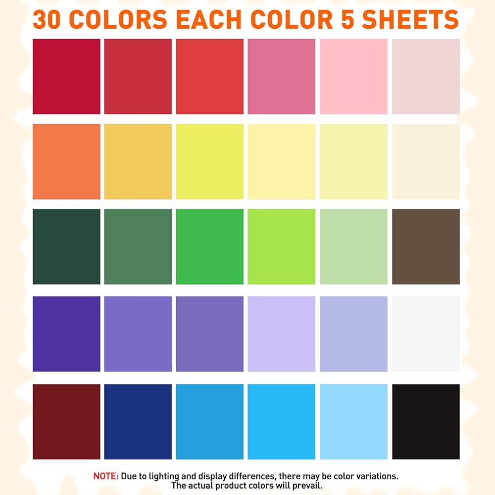 【150 Sheets of 30 Assorted Colors】Our colored cardstock contains 30 beautiful and popular colors to meet your handmade needs. You'll get 5 sheets of each color, including: burgundy, dark red, cherry red, coral red, magenta, blush pink, baby pink, burnt orange, golden yellow, canary yellow, lemon yellow, cream yellow, hunter green, forest green, kelly green, lime green, mint green, navy blue, royal blue, azure blue, sky blue, light blue, royal purple, purple, lavender, lilac, dark brown, black, beige, white.