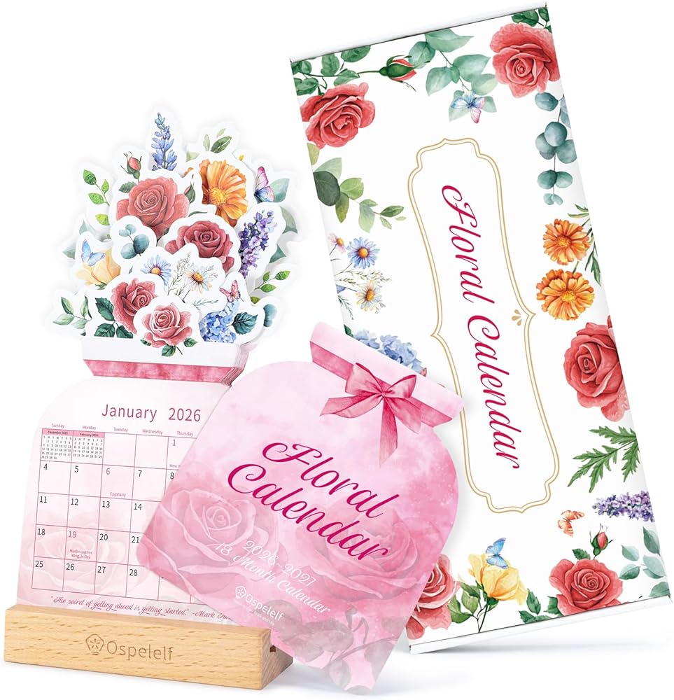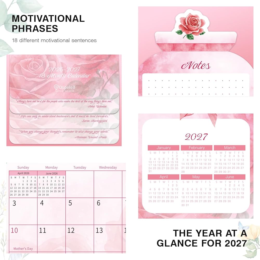 Ospelelf Floral Desk Calendar 2026-2027, Mini Pink Standing Motivational Rose Decorative Calendars, 18 Months, Home Office Decor Desk Accessories, Use January 2026 - June 2027