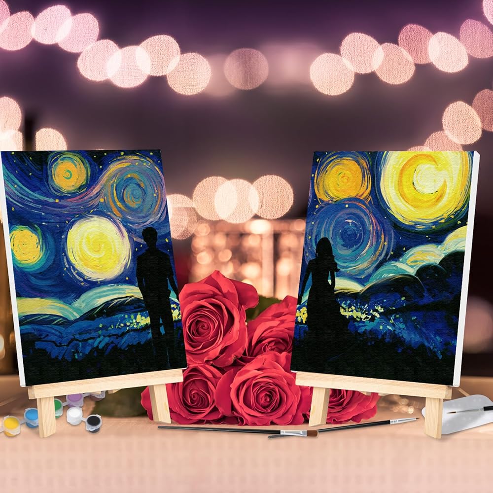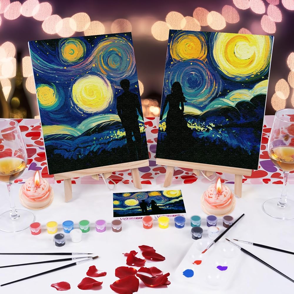 VOCHIC Date Night Idea Painting Kit for Couples Sip and Paint Kit for Adults Couples Pre Drawn Canvas to Paint for Adults Art Set Starry Sky Valentine 2 Pack 8" X 10"