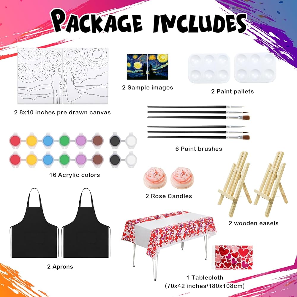 [Everything You Need] VOCHIC painting kit includes 2 packs of 8x10in pre-sketched canvas, 2 black aprons, 2 tabletop easels, 16pcs(8x2) acrylic colors, 6pcs(3x2) paint brushes, 2 pallets, and 2 sample images,2 candle,1 tablecloth.